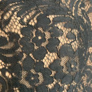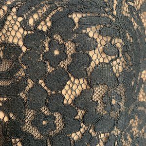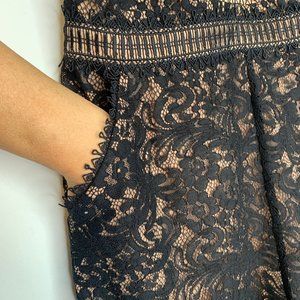 STYLESTALKER x Revolve Black Lace Plunge Romper with Nude Lining, Deep Pockets, Adjustable T-Back, and gorgeous eyelash lace. Side zip. Rare style. Sz S