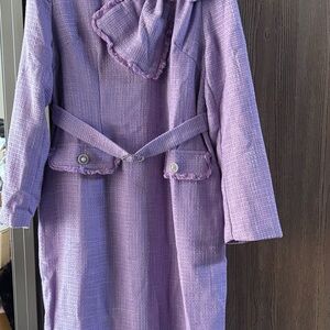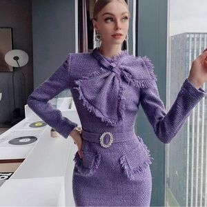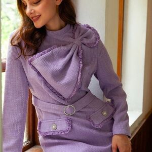 Elegant asymmetrical dress. Features a large bow and fringe details. Perfect for formal occasions.