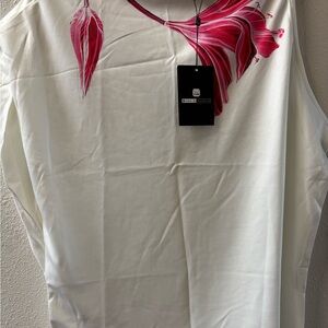 This stylish tank top from STYLEWE features an asymmetrical design with a vibrant pink floral pattern on a crisp white background. The sleeveless cut and modern artistic style make it perfect for a fresh, summery look.