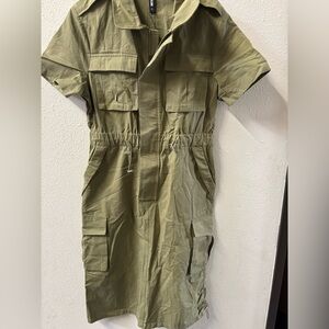 This elegant midi dress by STYLEWE features a striking asymmetrical ruched design in a sophisticated green hue. The plunge neckline and short sleeves add a touch of modern flair, making it perfect for both casual and work settings. Crafted from a soft, stretchy fabric, it offers comfort and ease of movement while maintaining a chic silhouette.