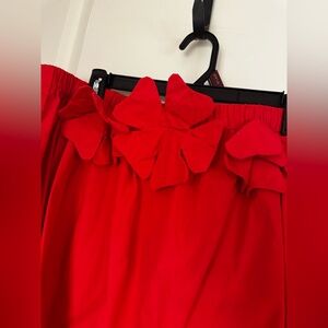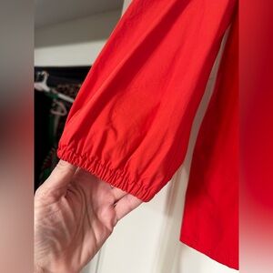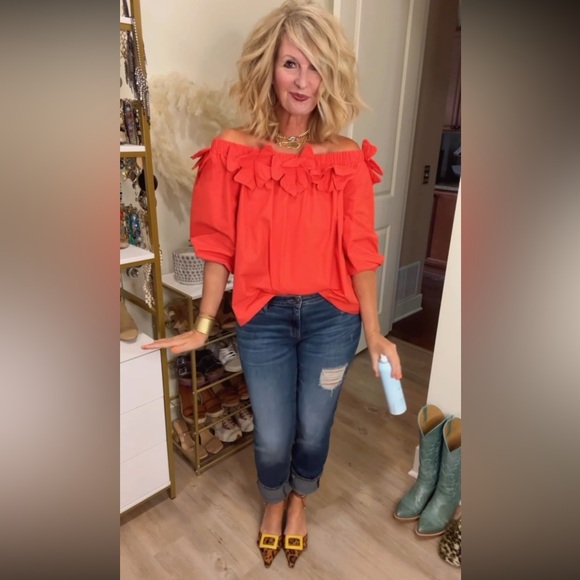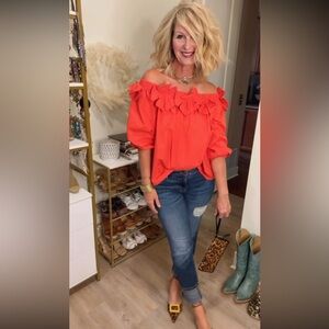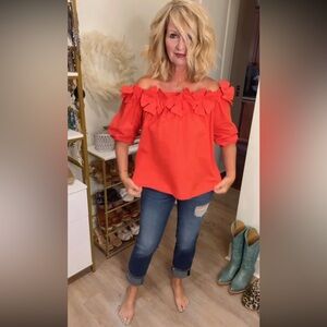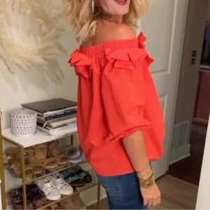 Vibrant coral off-shoulder blouse with ruffle and rosette trim detail. Three-quarter puff sleeves for a feminine look and elastic across the top. Lightweight fabric. Easy to dress up or down.