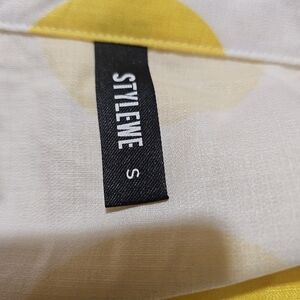 Chic shirt with a playful yellow pattern. Ideal for a fresh, stylish look. PTP 18.5 LENGTH 27 SLEEVE LENGTH 21.5 100% Poly