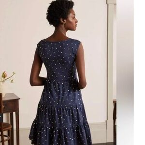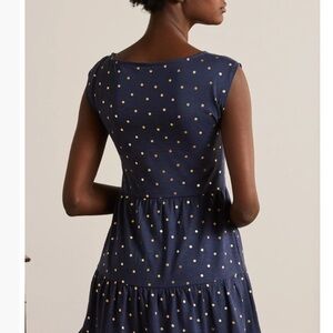 Boden romaine dress in blue with gold polka dots. Sleeveless with a tiered skirt. So great for spring and summer! Easy to throw on with a pair of white sneakers and look great. Cotton and modal blend.