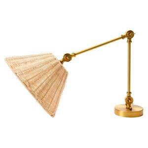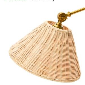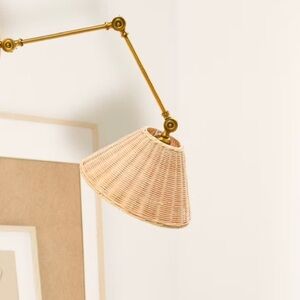 STYLISH BOHO ADJUSTABLE BRASS WALL SCONCE WITH BEIGE RATTAN SHADE - NEW IN BOX