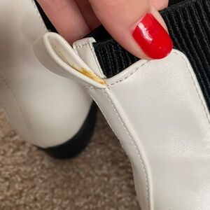 Cute, like new edgy white and black ankle boots for women with silver accent on toe. Perfect for an effortless and timeless rocker look, an edgy accessory for office outfits, or a unique flat boot for a night out! Versatile and comfortable, perfect for elevating any outfit!