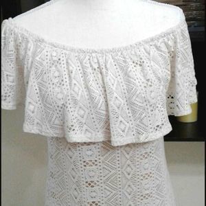 Off white midi dress in a laced fabric with a ruffled neckline. This dress has a A-line skirt for a flowy silhouette. This is a versatile dress because it can be worn off-shoulder or as a scoop neck. Elastic on the neckline. Shell is 60% rayon, 27% polyester, 3% spandex and 10% linen. Fully lined in a 100% polyester fabric.