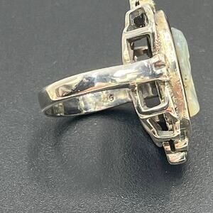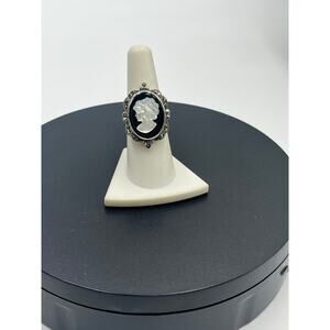 Stunning cameo stering silver vintage ring. Left facing profile made of natural mother of pearl. Accented with marcasite gemstones surrounding the cameo shell set on a black setting. Sterling silver, tested positive as such and marked as 925. Straight shank. The cameo appears to be carved from genuine materials, shell or mother of pearl. showing fine detail in the classical female profile. The sterling silver setting displays beautiful oxidation that enhances the intricate details of the filigree work.