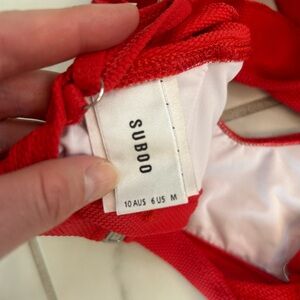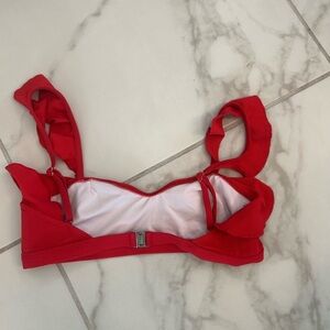 SUBOO bikini top in bright red. Ruffle trim along the neckline. Adjustable shoulder straps with ring detail. Smooth white inner lining.