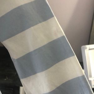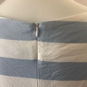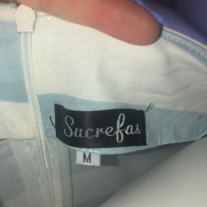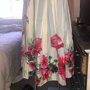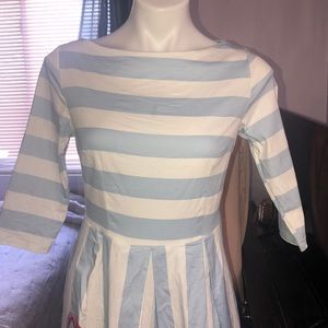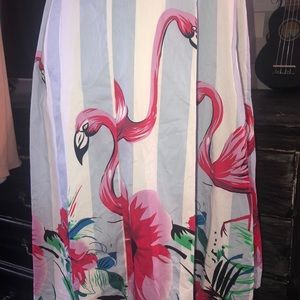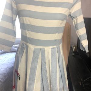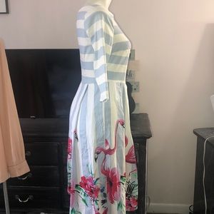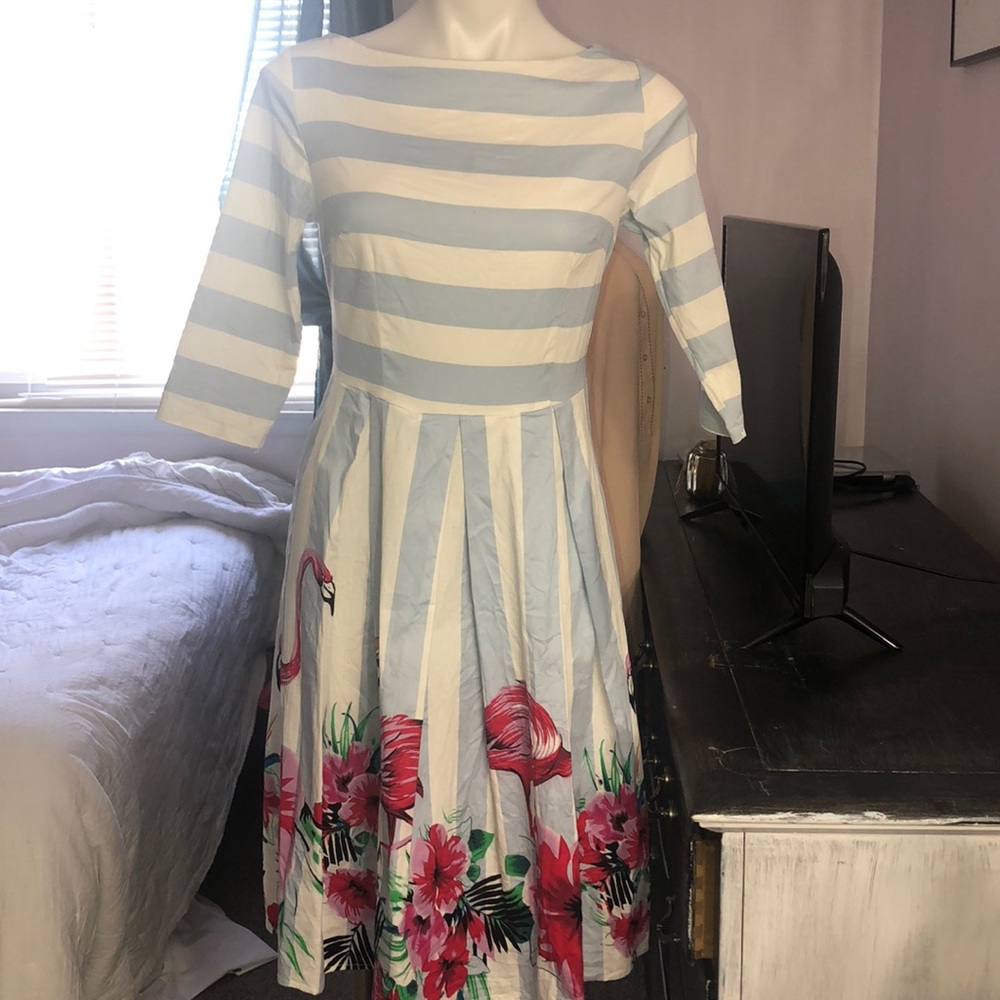 SUCREFAS ladies dress size medium, Quarter sleeve, zippered back, cinched waist, periwinkle blue and white pinstripes with a fun Floral and flamingo pattern at the bottom, 38 inches in length 35 inches in the bus, some minor discoloration on the left hand shoulder sleeve as shown last pic very minor.