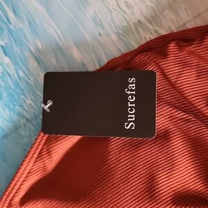 Rust-colored ribbed halter bikini top with matching high-waist bottoms. Textured fabric. Tie and ruched details. Stylish and versatile swim set. NWT Size Medium