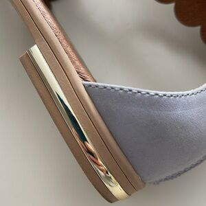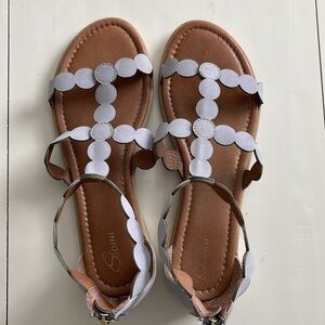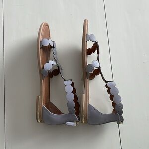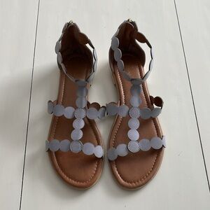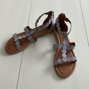 So cute and comfy! Eye-catching straps formed from linked circles add modern, geometric style to this gorgeous sandal. Light grey neutal color works with so much, blacks, whites, denim blue, greys, neutrals, pastels and so much more. Pair with summer dresses, jeans, shorts or even swimwear, very versatile.