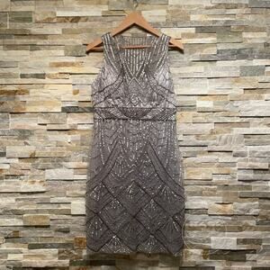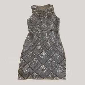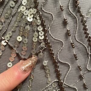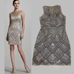 Step into timeless evening glamour with this Sue Wong Nocturne beaded cocktail dress, crafted in a shimmering champagne-silver palette with signature Art Deco detailing. Fully hand-beaded with sequins and metallic seed beads, this dress delivers that classic Sue Wong sparkle — perfect for weddings, holiday parties, and special occasions.