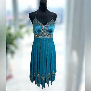 Handkerchief asymmetrical hem. Floral beading and sequins in shades of brown, copper, and gold. Halter tie at the neck with beaded ends. Empire waist. Bias cut.