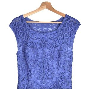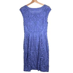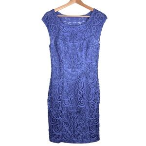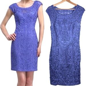 SUE WONG PERIWINKLE SOUTACHE LACE CAP SLEEVE ILLUSION FITTED SHEATH DRESS