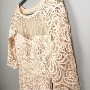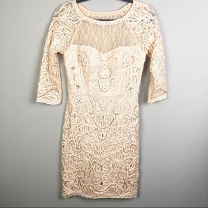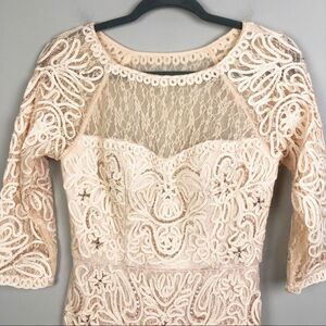 Absolutely stunning lace dress by Sue Wong Nocturne! 3/4 long sleeves. Lined in a sweetheart style neckline. Bead and rhinestone embellishments within the floral lace design. Classy and elegant! The color is a very pale blush/peach almost an ivory/beige. Excellent condition. Size 6.