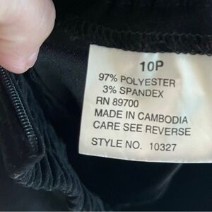 Black faux suede midi skirt, 10 petite, flat Front, elastic in back and back zip for expert fit. Some flex room in back with elastic in waist and zip. Excellent addition to your wardrobe capsule.