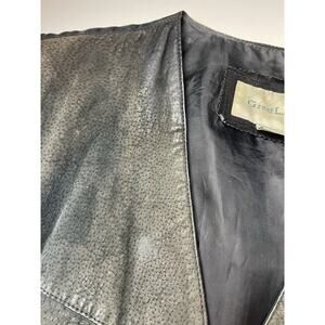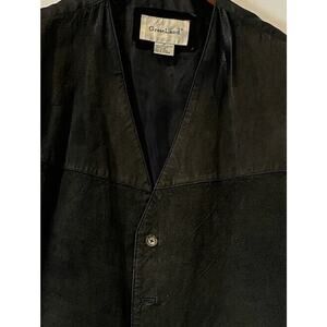 Very loved vest missing a button and the suede has worn off. This black suede leather vest from Greatland Apparel is a must-have for any fashion-forward man. With its Western biker theme and button closure, it's perfect for any occasion, whether it be a casual day out or a business meeting. The vest features pockets for added convenience.