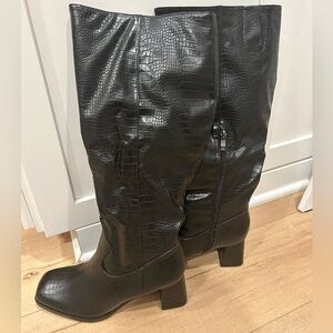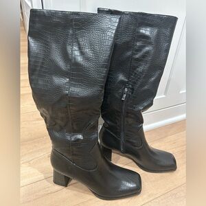 SUEDI Women's Knee High Black Faux Croc Boots - Tall, Square Toe, Chunky Heel