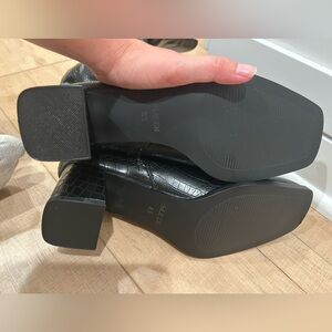 Stylish black croc-embossed boots. Perfect for any occasion. Featuring a crocodile-embossed synthetic leather upper / smooth PU leather upper (Optional), fabric lining, and durable latex insole, these boots have a sleeksquare toe and 2.4” chunky heel for a chic, minimalist look.