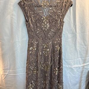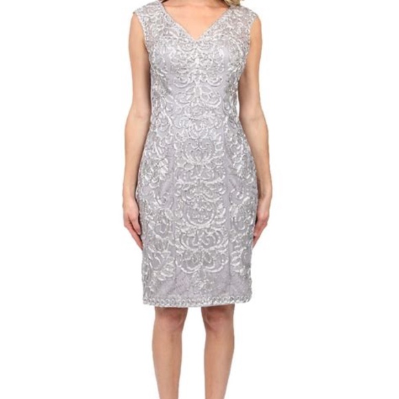 Tonal ribbon trim and soutache embroidery lavishly texture a lustrous tulle sheath crowned with slight cap sleeves and finished by an alluring sheer back.. This dress is an absolute show stopper! Gorgeous silver color with gorgeous detail. The dress has a built in bra .