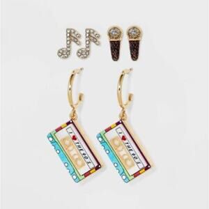 This set of three earring pairs features unique musical motifs on each, including microphones, music notes, and cassette tapes. Complete with both huggies and stud earrings, these are the perfect gift or stocking stuffer.