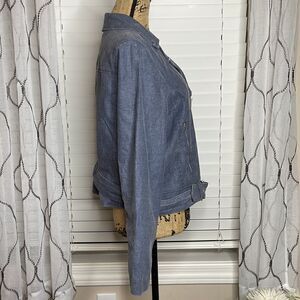 In perfect condition. Size large. Linen denim style long sleeve zip up belted jacket. Lined with 100% rayon. Jacket 70% cotton 30% linen.