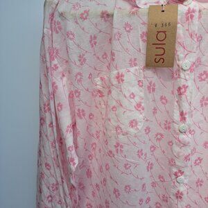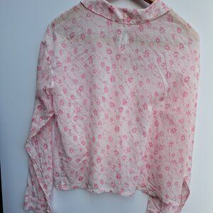 Peter pan collar. Soft pink exterior, brighter interior. Never worn. Beautiful, soft look with long sleeves and pocket. Soft cotton.