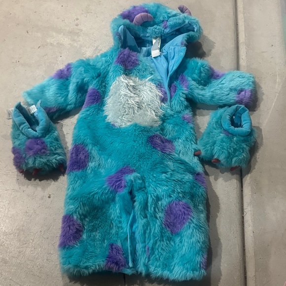 Adorable fuzzy monster costume in blue and purple. Features a hood with horns and a furry texture. Rubs big! So warm