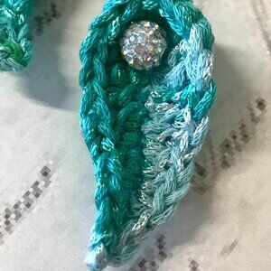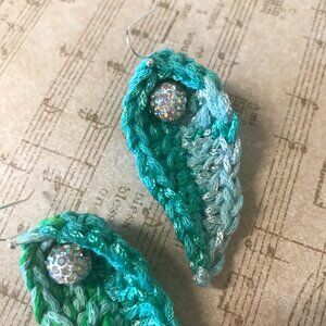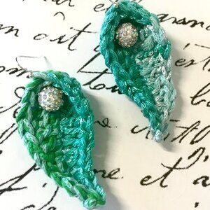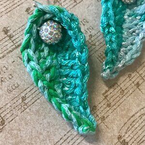 SUMMER LEAF EARRINGS Handmade Blue & Green Fiber with Rhinestone Beads
