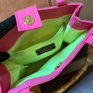 Tianni Handbag Pink w/Embroidered Flip Flops and Beach Bags Bamboo Look Handles. Snap closure at the top and one interior zip close pocket. Approx: 9.25"L X8"H X 4"W