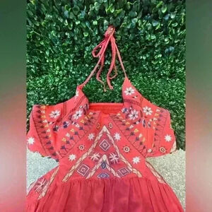 This vibrant red maxi dress features a halter neckline and intricate ruching and embellishments on the bodice, perfect for resort wear.