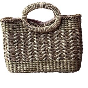SUMMER STRAW LINED WOVEN HANDBAG WITH CIRCLE HANDLE, & ZIPPED CLOSURE COASTAL