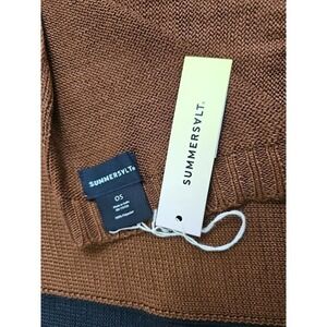 This Summersalt shawl scarf is perfect for any season. It features a color block pattern in black and brown, made of knit polyester fabric from India. The scarf is a rectangle shape, suitable for both men and women, with accents of color block and neck warmer features. Garment care requires a gentle hand wash only. The scarf is brand new, with tags attached, and ready to be personalized if desired.