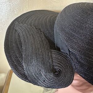 This hat is an incredibly beautiful piece of 1940's fashion/millinery history! The hat is made of fine black straw. The crown is round, surrounded by a wide brim that only extends towards the front and sides, but not the back, as photographed. This creates a most creative shape that makes this hat unique. At both sides, where the brim meets the crown there are straw "wings" that are superimposed. There is a thin strip of veiling that falls down and can be worn towards the front, or over the hair at the back. It can also be tucked into the crown. What a beauty!
