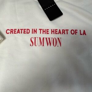 Cream t-shirt featuring bold red text 'Created in the Heart of LA SUMWON'.