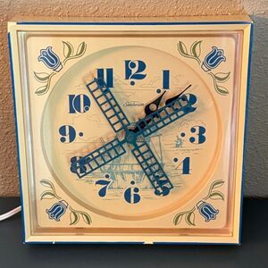 A rare find! Vintage Sunbeam wall hanging clock with Dutch windmill/tulip design. In very good vintage condition, does have a few dings, see pics.