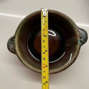 The bowls are 4.5 in across and 2 in high. They appear to be made in a green and brown drip glaze and are in very good vintage condition, with no chips or crazing. One of the bowls on the bottom, there appears to be a flaw that may be from the manufacturing process. Please see photos for details.