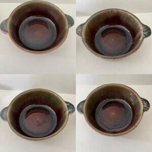 The bowls are 4.5 in across and 2 in high. They appear to be made in a green and brown drip glaze and are in very good vintage condition, with no chips or crazing. One of the bowls on the bottom, there appears to be a flaw that may be from the manufacturing process. Please see photos for details.