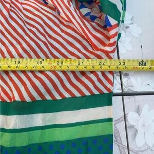 Chic button-down shirt with a bold geometric design. Features a mix of green, blue, red, and white. Ideal for a stylish look.