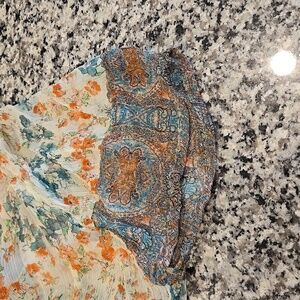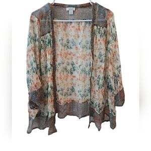 Pre-owned. Excellent condition. Faux silk. Lagenlook. Sleeves are very low.....Pretty floral print. Open cardigan, no buttons.