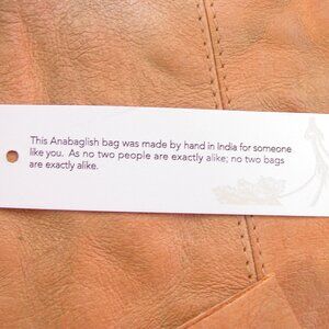 Anabaglish was the name of founder Mia's ancestors' farm in Southern Scotland. Anabaglish bags are made of real leather, cotton, or wool, and hand-dyed in colors inspired by nature. This beautiful tote bag is genuine tan leather with a gold metallic overlay. Embossed floral accent has depth and character. Front row of gold studs highlights this accent. Zip closure. Inner zip pocket and two slip pockets. Hand Made in India. Retail: $160.