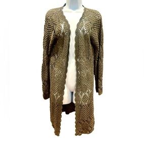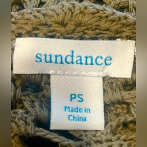 SUNDANCE Aria Green Crochet Knit Duster Open Cardigan. Beautiful olive green color. Note- camera slightly auto corrected color. Color is same as stock photo. Crochet design. Long sleeve. Open front. 100% cotton. Size small petite excellent condition. Women’s size petite small. Measures approximately 20 inches flat across chest and 36 inches in length.