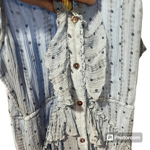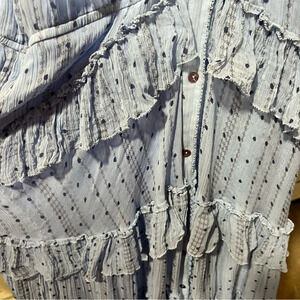 SUNDANCE ~ Blue Polka Dot Cupro Tiered Ruffle Sleeveless Maxin Length Dress. Size small. In good preowned condition. Dress is lined and has mother of pearl buttons and elastic waist.