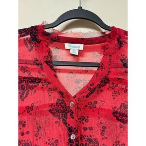 Sheer red floral tiered tunic blouse with raw edges and slightly high/low design. Button front and cuffs. No camisole. Red with black floral pattern. Oversized, relaxed fit.