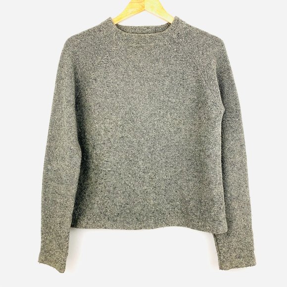 Cozy sweater with a slightly cropped style that falls just above the hips. Really cute with high waisted jeans or skirt!