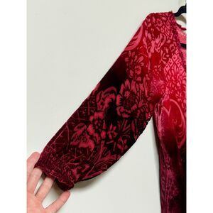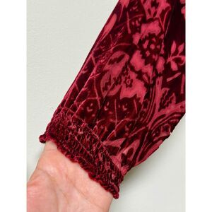 Deep red/burgundy velvet burnout top. V-neck with elastic at the wrists. Semi-sheer, tunic cut. A bit oversized. 72% rayon, 28% silk. Dry clean only.