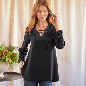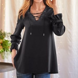 Beautiful romantic black 🖤 100% Silk blouse. Lovely laced neckline and ruffled sleeve details.