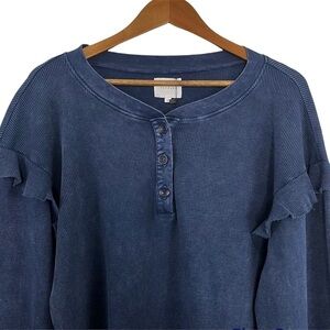 Sundays Wren Thermal Pullover Top. In a dark blue color, intentional fading and distressing throughout. Ruffle detail on sleeves. Button detail on front at neckline. Thermal cotton material. Model pics are same style but different color, for reference only.