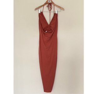 SUNDRY Coral Ruched Halter Slit MIDI Dress