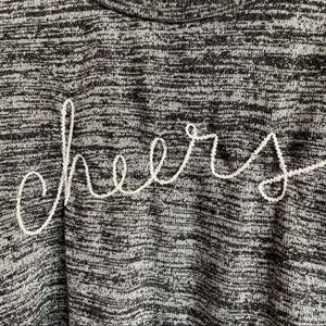 Cozy comfy light sweatshirt/top with embroidered “Cheers” and adorable black side ties. There are a few sequins on the writing (but they’re not too flashy). So soft and in excellent condition. Size 1, which is a size small. (Size chart included.)